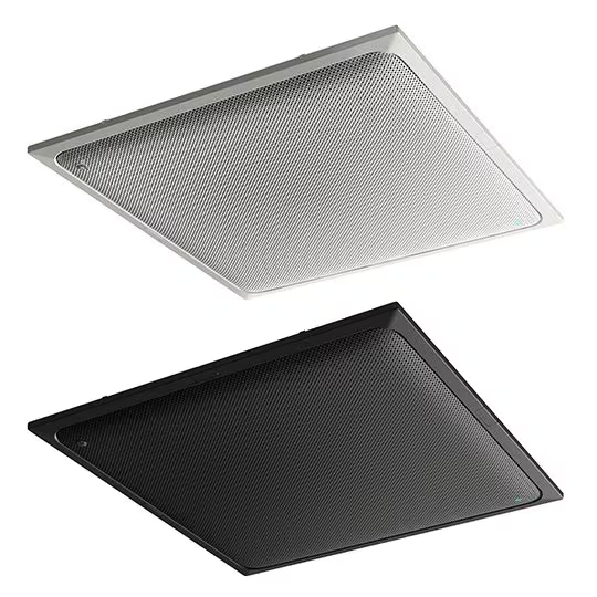 オフィスはもちろんのこと、病院や金融機関など、多様なシーンへの設置に違和感のないよう考慮し、白を基調にした威圧感のないコントロールユニット。整然とレイアウトされた操作子により、動作状況と操作方法が直感的に分かります。また、スピーカーは設置環境の色彩に応じて選択できるよう、黒と白の2色のカラーバリエーションを用意しています。